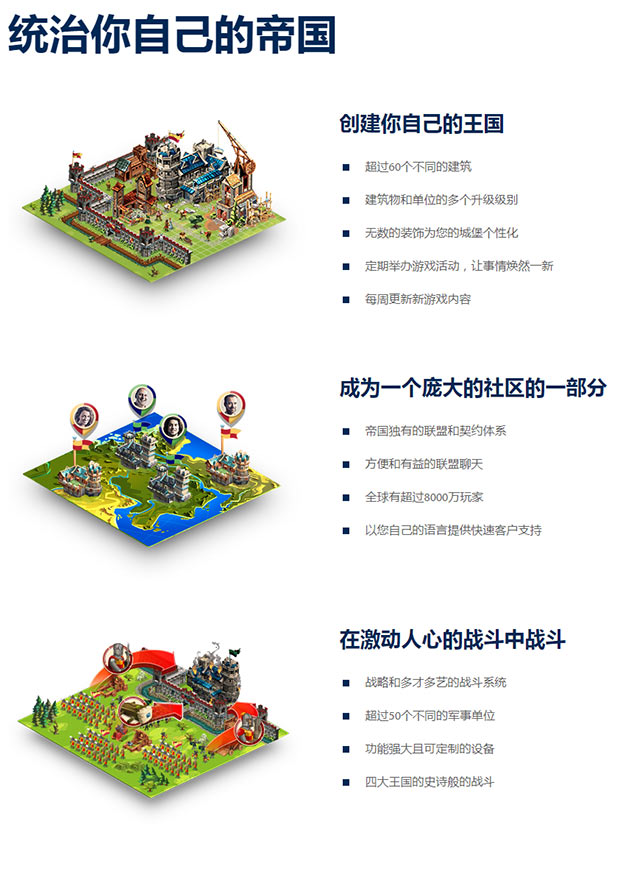 帝国之战中文版:一款超好玩的中文战略类小游戏,游戏中玩家将建立自己的城堡并训练一支强大的军队,在动态的世界地图上与中世纪的骑士奋战,扩充帝国的版图。游戏中,玩家可以与世界各地的玩家共同游戏,与其他玩家形成强大的联盟,而游戏初期只要跟着任务进行,便可以了解游戏的大至内容。本作曾获得欧洲最佳网页游戏奖。