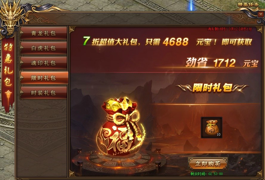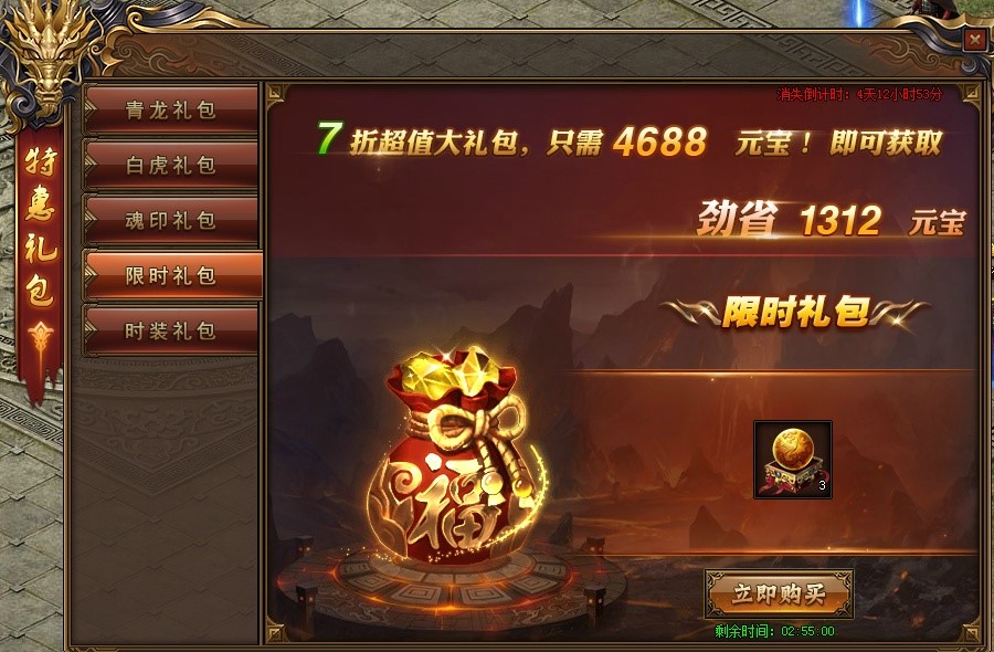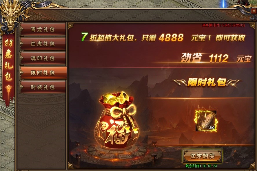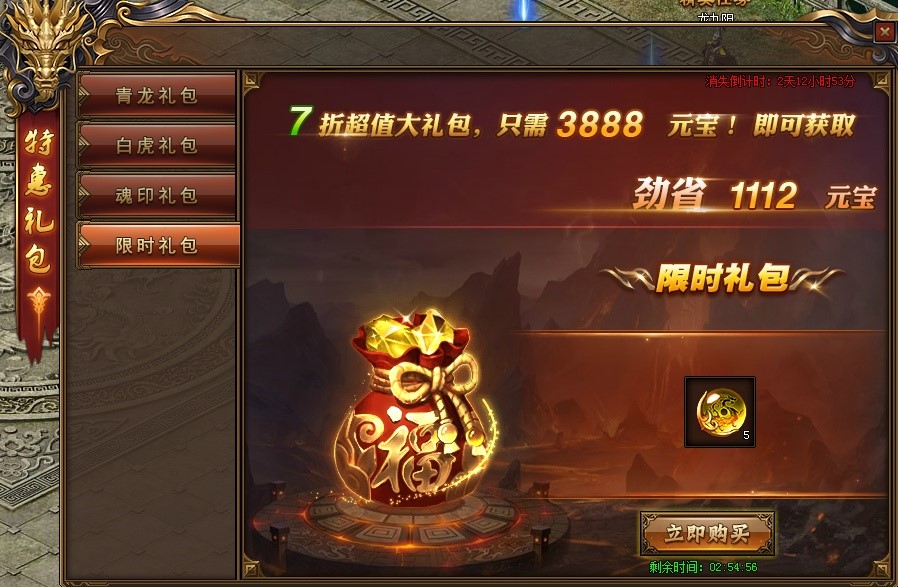活动内容:开服第2-7天,每日限时礼包不打烊,助你开服竞技快人一步。最后一档礼包更可购买5次,买到就是赚到.